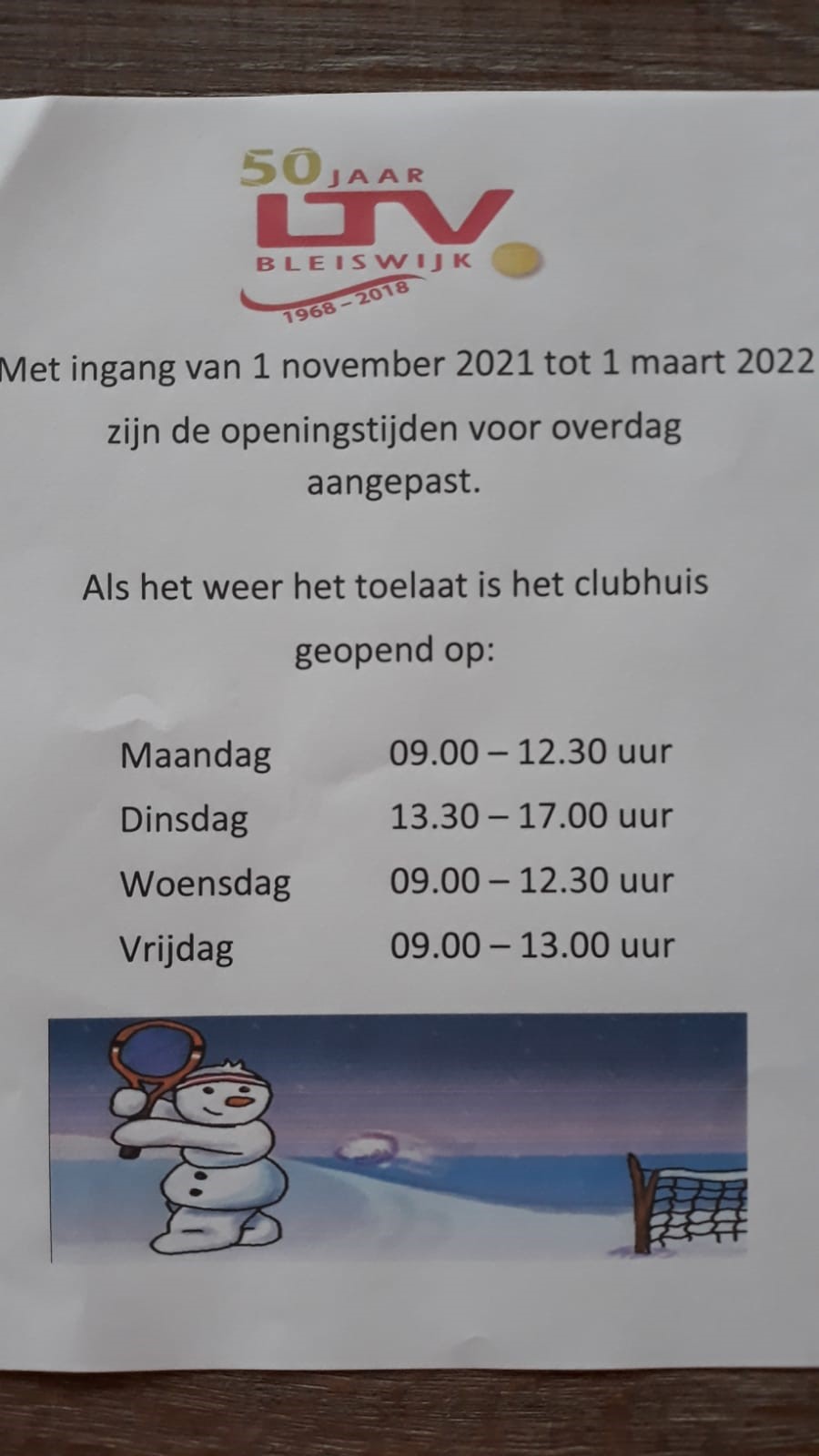 Vanaf 25 januari mag het clubhuis de komende drie weken in elk geval weer geopend worden tot 22.00 's avonds. Wat zijn onze openingstijden?